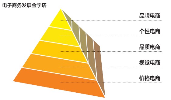 我认为电子商务发展的第一阶段,是价格电商。价格电商处于金字塔的底部,这个阶段将会持续很长一段时间,依赖的是价格上的促销,更多消费者对商品是价格敏感的。